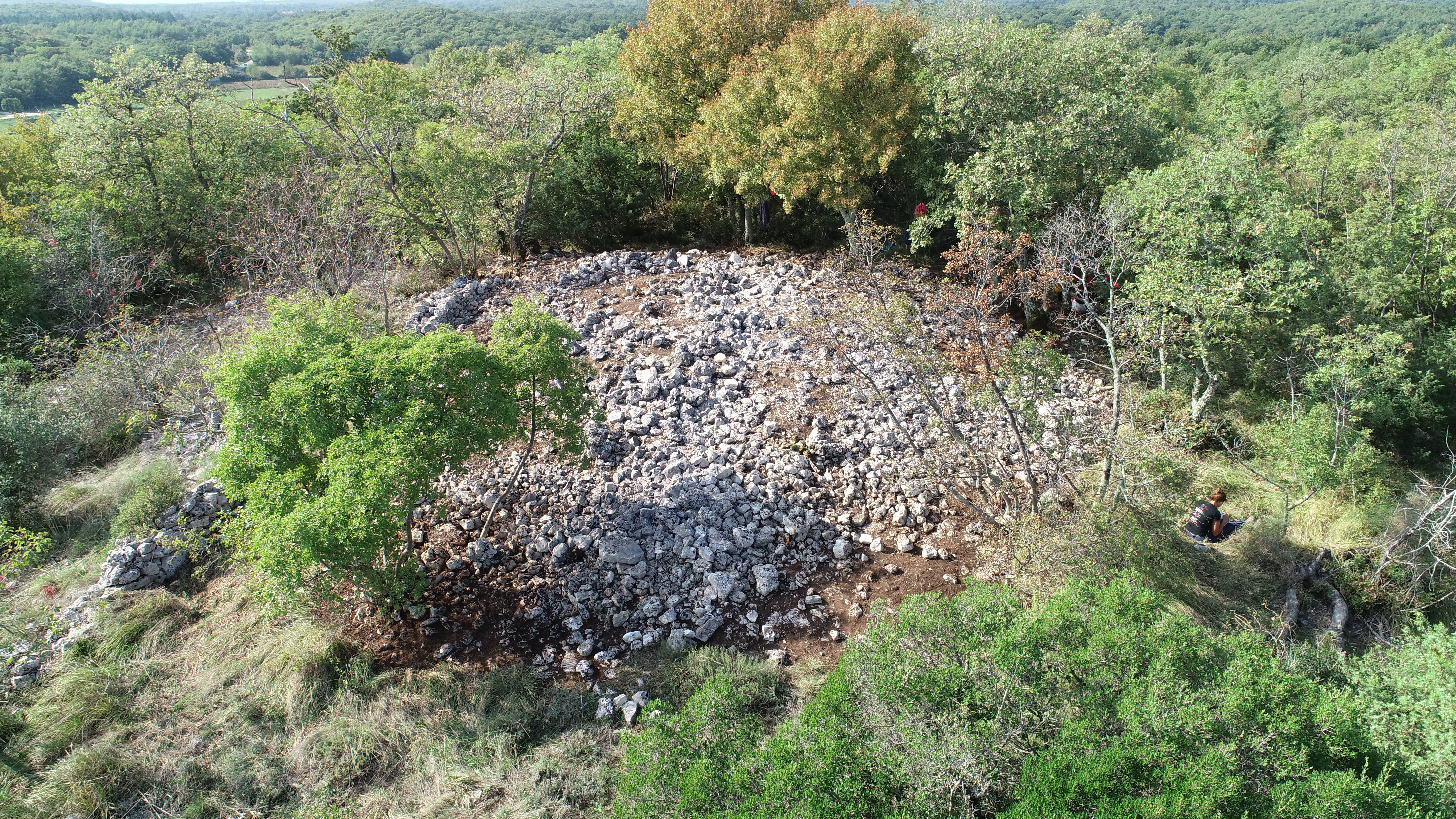 Der steinerne Grabhügel – Tumulus - auf Milovići (Milojev vrh) befindet sich 600 m von der prähistorischen Burgsiedlung Gradina entfernt. Es wird vermutet, dass im Hügelgrab Angehörige einer Elite aus gerade dieser befestigten Siedlung begraben wurden. In den Jahren 2019 und 2020 wurden im Tumulus die Überreste von fünf Gräbern mit jeweils einem oder mehreren begrabenen Skeletts erforscht, von denen eines vorläufig in die Frühbronzezeit (2100-1700 v. Chr.) datiert wurde, doch wahrscheinlich gab es noch zwei weitere Gräber, die zerstört wurden. Die meisten Gräber wurden aus Steinschiefer, gemeißelten und aufgesetzten Platten errichtet, die von der Außenseite durch Trockenmauerwerk aus halbbearbeiteten Steinen befestigt waren. Einige Gräber hatten auch erhalten gebliebene Deckplatten. Ein Teil der Gräber bestand nicht aus Schiefer, sondern wurde mit Trockenmauern aus Stein gebaut. Alle Gräber sind in gleicher Nordost-Südwest-Richtung ausgerichtet. In den Gräbern wurden neben den Skelettresten der Verstorbenen (Erwachsene, jüngeren und mittleren Alters, sowie Kinder im Alter von 5 bis 14 Jahren), auch Schmuck aus Bernsteinperlen, Fragmente von spiralförmigen Bronzeketten und Haarklammern gefunden. Grab 4 war das reichhaltigste, in die mehrere Verstorbene begraben waren, und der Boden des Grabes war mit einer Kieselsteinschicht bedeckt. Es wird angenommen, dass die in Steinhügeln begrabenen Verstorbenen eine bedeutende Rolle innerhalb der bronzezeitlichen Gemeinschaft Istriens spielten, beziehungsweise eine Elite in der prähistorischen Gesellschaft repräsentierten. Dies wird durch die Tatsache untermauert, dass sie auf strategischen Lagen positioniert wurden, auf Hügelkuppen, als markante Punkte in der Gegend.