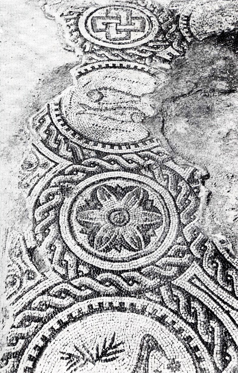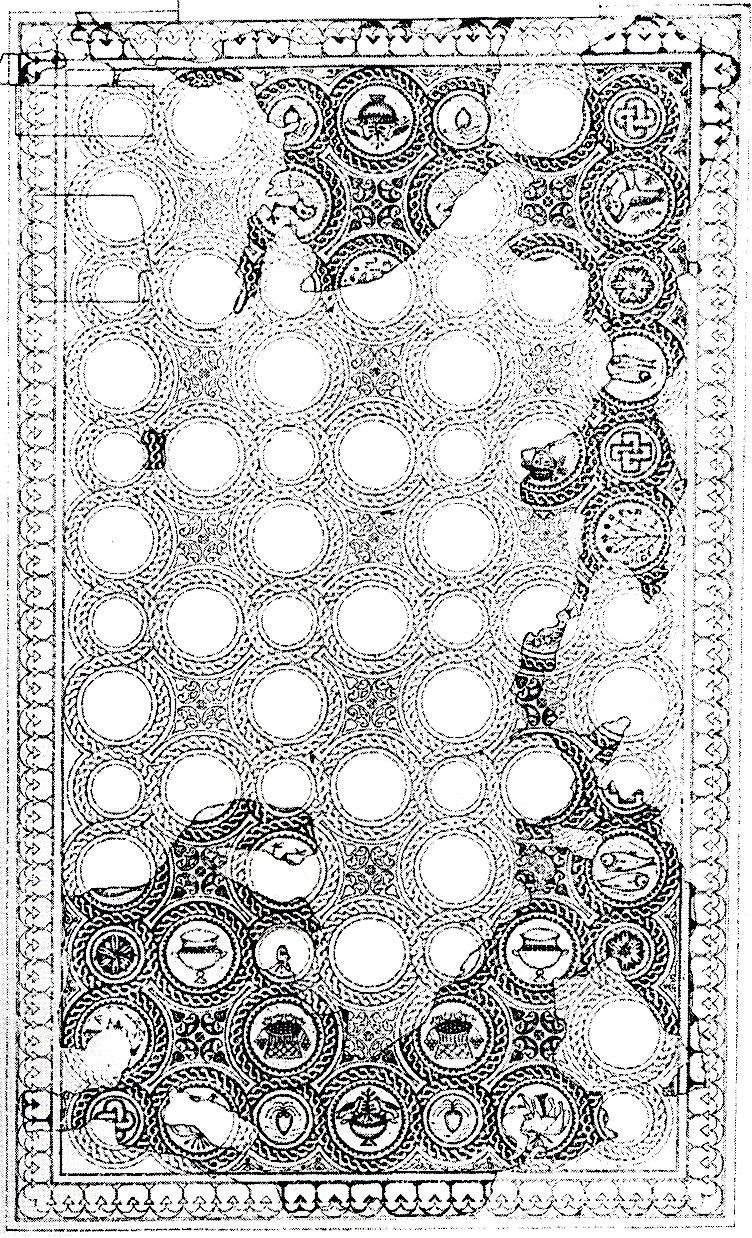 Das aus weißen, schwarzen und roten quadratischen Steinchen hergestellte Mosaik in der Apsis, hat eine schmale Bordüre mit einer gewellten Ranke und stilisierten Efeublättern, und die gesamte Fläche des Halbkreises ist mit einem Motiv aus sich überlappenden kleinen Kreisen bedeckt, die durch gegenseitige Überschneidungen, vierblättrige, schwarze und rote geometrische Formen auf einem weißen Untergrund bilden. Das Mosaik des rechteckigen Raumes vor der Apsis besteht aus Stein-, Keramik- und Quadraten einer bunten Glaspaste. Obwohl der gesamte Raum noch nicht erforscht wurde, befand sich wahrscheinlich um alle vier Seiten ein Gürtel mit Darstellungen von Haus- und Wildtieren in der Landschaft (Bäume, Pflanzen), während im mittleren Teil ein Stück der Oberfläche mit einer Zeichnung von reich mit Trauben behangenen Weinranken bedeckt war, und in diesem Netz sind viele Vögel dargestellt. In den Ecken der Halle befinden sich architektonische Motive, Darstellungen einfacher Gebäude mit Baldachinen, Säulen und Kuppeln, typisch für eine Gartenarchitektur, so dass das gesamte Mosaik eine Kombination aus natürlicher Umgebung und menschlichen Eingriffen darstellt. In den derartig gestalteten Elementen sind schlecht erhaltenen gebliebene Frauengestalten zu erahnen, eine allegorische Darstellungen der vier Jahreszeiten. In der Mitte der Halle befand sich jedoch sicherlich die wichtigste Darstellung, da sehr schlecht erhaltene menschliche Gestalten zu erahnen sind, eine Frau mit nacktem Oberkörper und ein mit Speer und Schild bewaffneter männlicher Krieger, was wahrscheinlich eine griechische mythologische Szene darstellt, die in der Mosaikkunst der Römerzeit üblich waren.