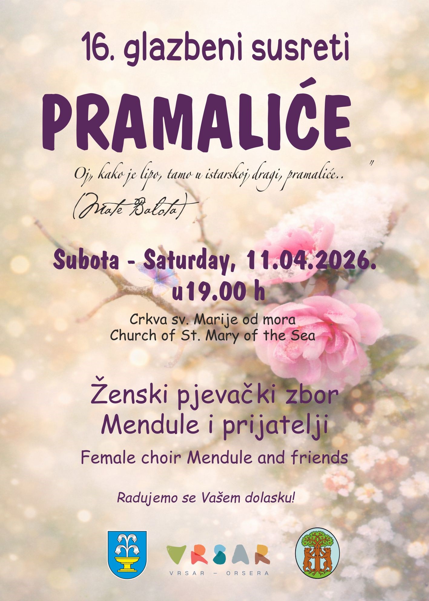 Glazbeni susreti „Pramaliće“ održat će se u subotu, 11. travnja u 19 sati u crkvi sv. Marije od Mora u Vrsaru, prostoru koji svojom akustikom i ambijentom pruža poseban doživljaj vokalne izvedbe.