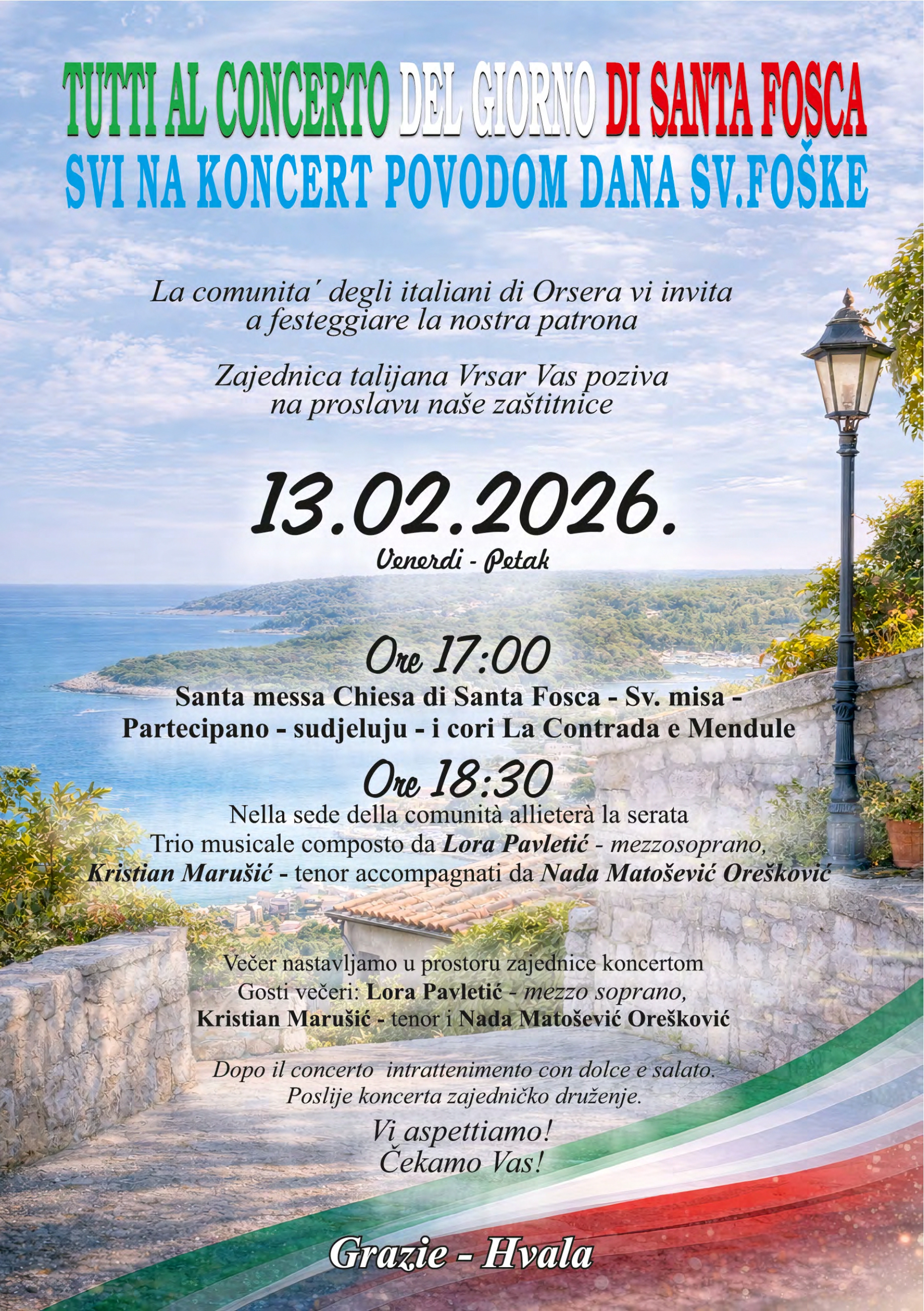 Nakon mise, u organizaciji Zajednice Talijana CI Vrsar – Orsera, održat će se koncert u prostorijama Zajednice Talijana – Vrsar (Ul. Gradska vrata 2, 52450 Vrsar) s početkom u 18:30 sati.