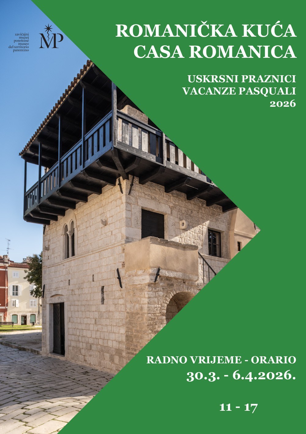 U razdoblju od 30. ožujka do 6. travnja 2026., od 11 do 17 sati, posjetitelji imaju priliku besplatno razgledati stalni postav „Kultura stanovanja u Poreču u 19. i 20. stoljeću“, smješten u obnovljenoj Romaničkoj kući – jednom od rijetkih sačuvanih primjera stambene arhitekture romaničkog razdoblja u Istri.