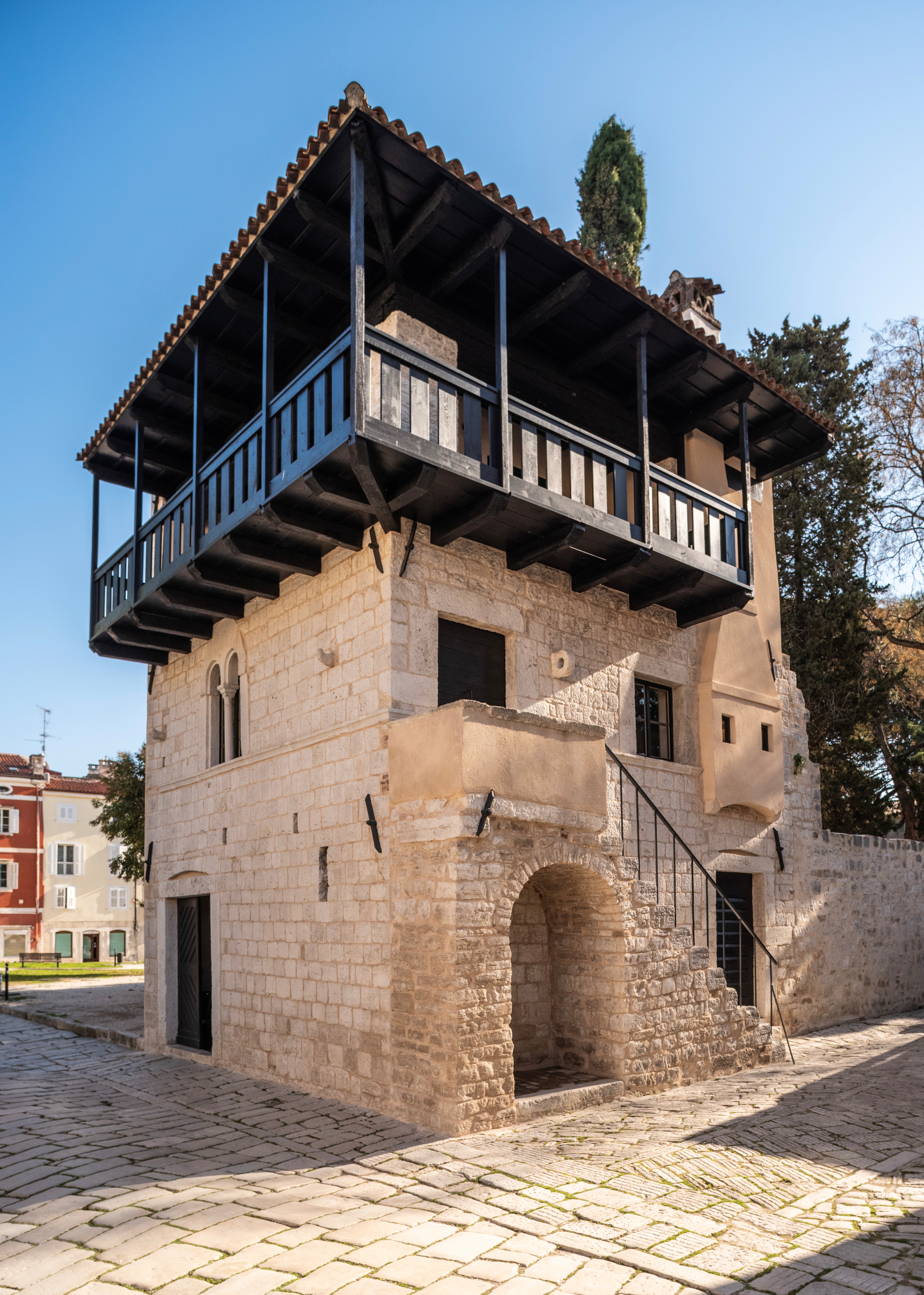 Izgrađena u drugoj polovici 13. stoljeća, ova skladna dvokatnica jednostavnog tlocrta s prepoznatljivom romaničkom biforom svjedoči bogatoj i slojevitoj povijesti. Tijekom stoljeća doživjela je niz preobrazbi – od dogradnje vanjskog stubišta u razdoblju između 16. i 17. stoljeća, do značajne obnove 1926. godine pod vodstvom konzervatora Ferdinanda Forlatija. Nakon razaranja u Drugom svjetskom ratu, ostaje samostalan objekt te postaje prvi porečki spomenik obnovljen za javnu namjenu.