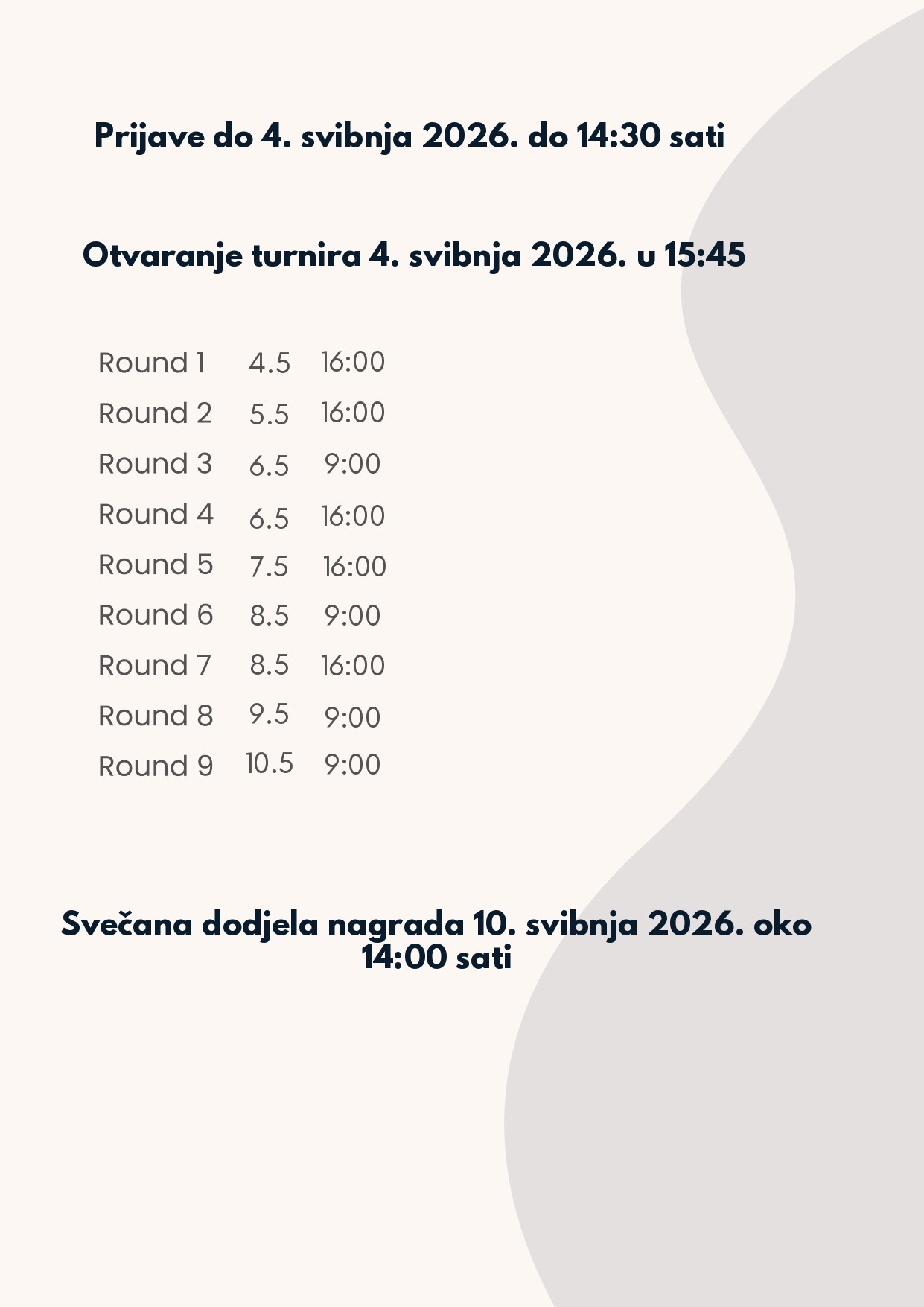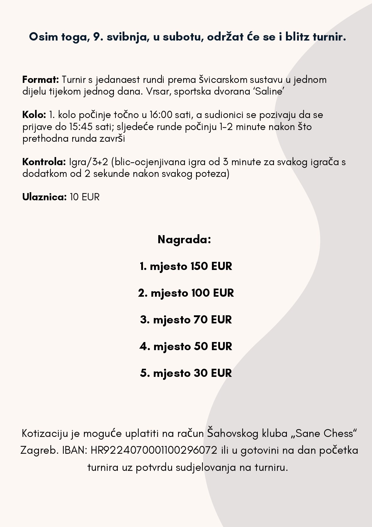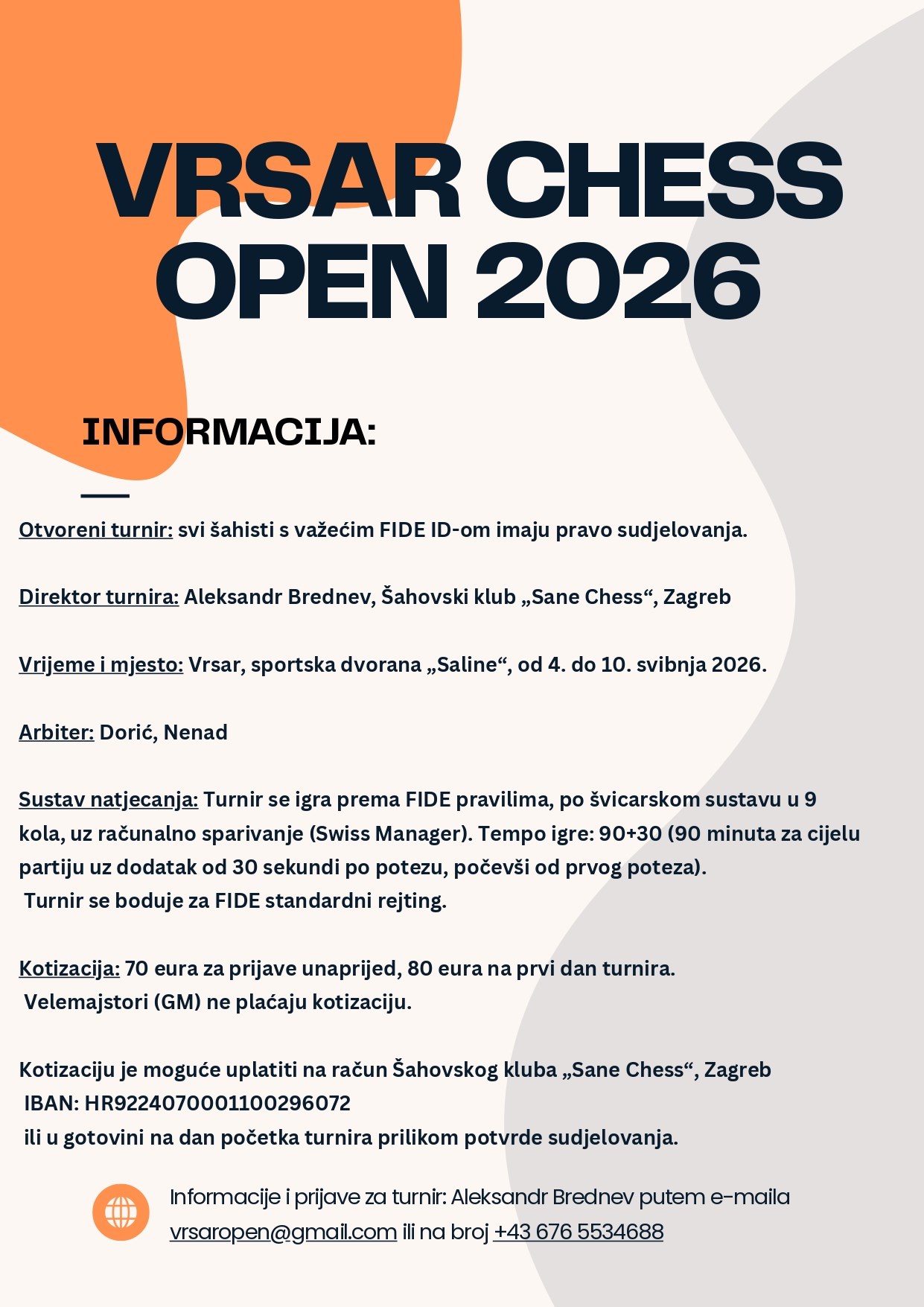 Šahovski klub „Sane Chess“ iz Zagreba s ponosom organizira međunarodni turnir Vrsar Chess Open 2026, koji će se održati od 4. do 10. svibnja 2026. godine u sportskoj dvorani „Saline“ u Vrsaru.
