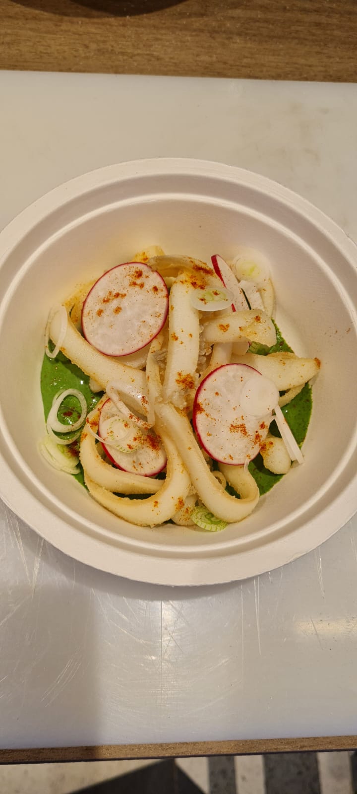 Serving: place 2-3 tablespoon of creamed spinach o a plate and place fried cuttlefish strips on top. Decorate with thinly sliced radish rounds and if desired, a sprinkling of smoked paprika.