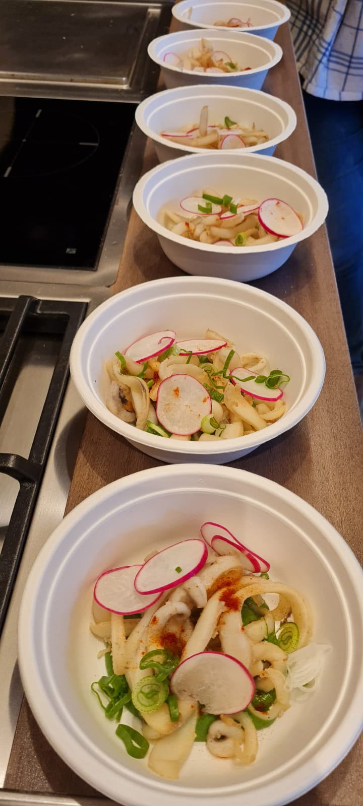 Heat the oil and fry the cuttlefish strips very briefly in plenty of hot oil, in order for them not to harden.