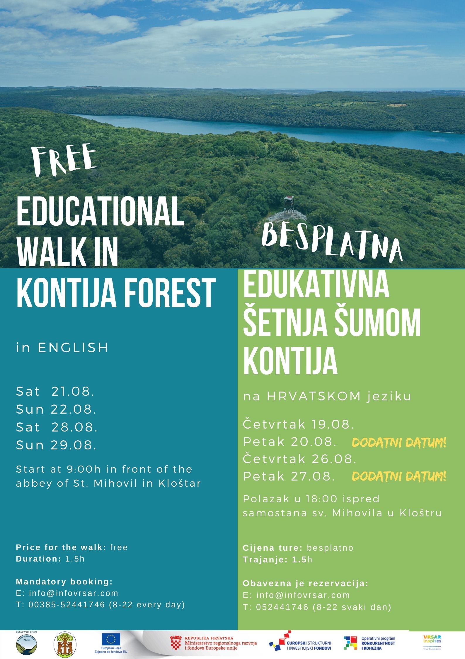 Educational walks will take place on an easy path without obstacles, suitable for all ages. The walk will be for about an hour and thirty minutes long and is limited to 15 participants. The starting and ending point of this circular guided tour is the monastery of St. Mihovil in Kloštar, not far from which it is possible to park cars and securely tie bicycles in the designated places next to the restaurant "Patricija" in Kloštar (bring your padlocks). Walks in English will take place on Saturdays and Sundays starting at 9:00 am, while Thursday afternoons starting at 6:30 pm are reserved for walks in Croatian. Do not miss this unique opportunity to experience the richness of the flora and fauna of the magical forest of Kontija and relax within the beautiful nature of this protected area.