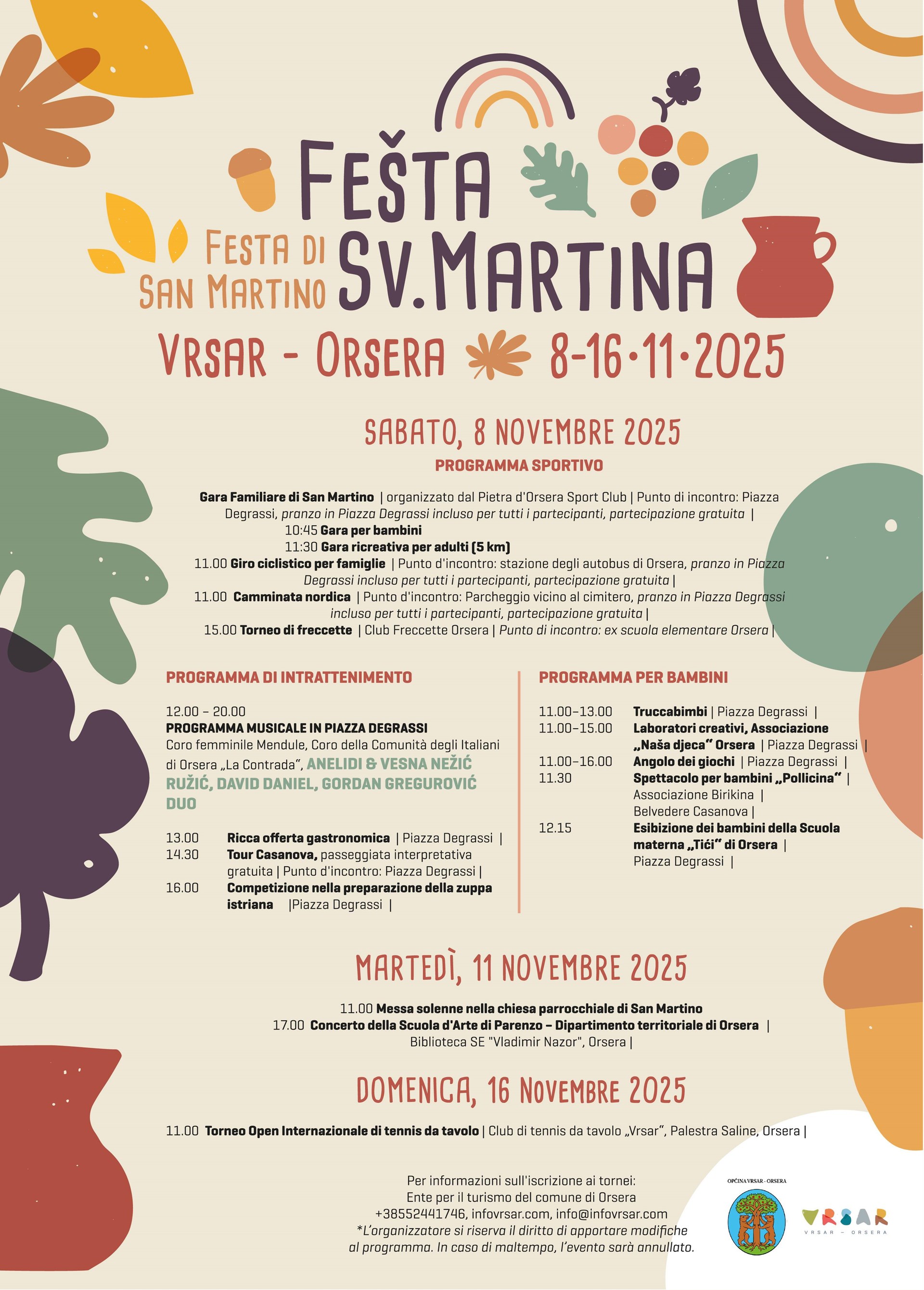 Quest'anno l'evento si terrà l'8 novembre 2025 nel centro di Vrsar-Orsera, dove sarà preparato un programma ricco e variegato che soddisferà tutte le generazioni.
